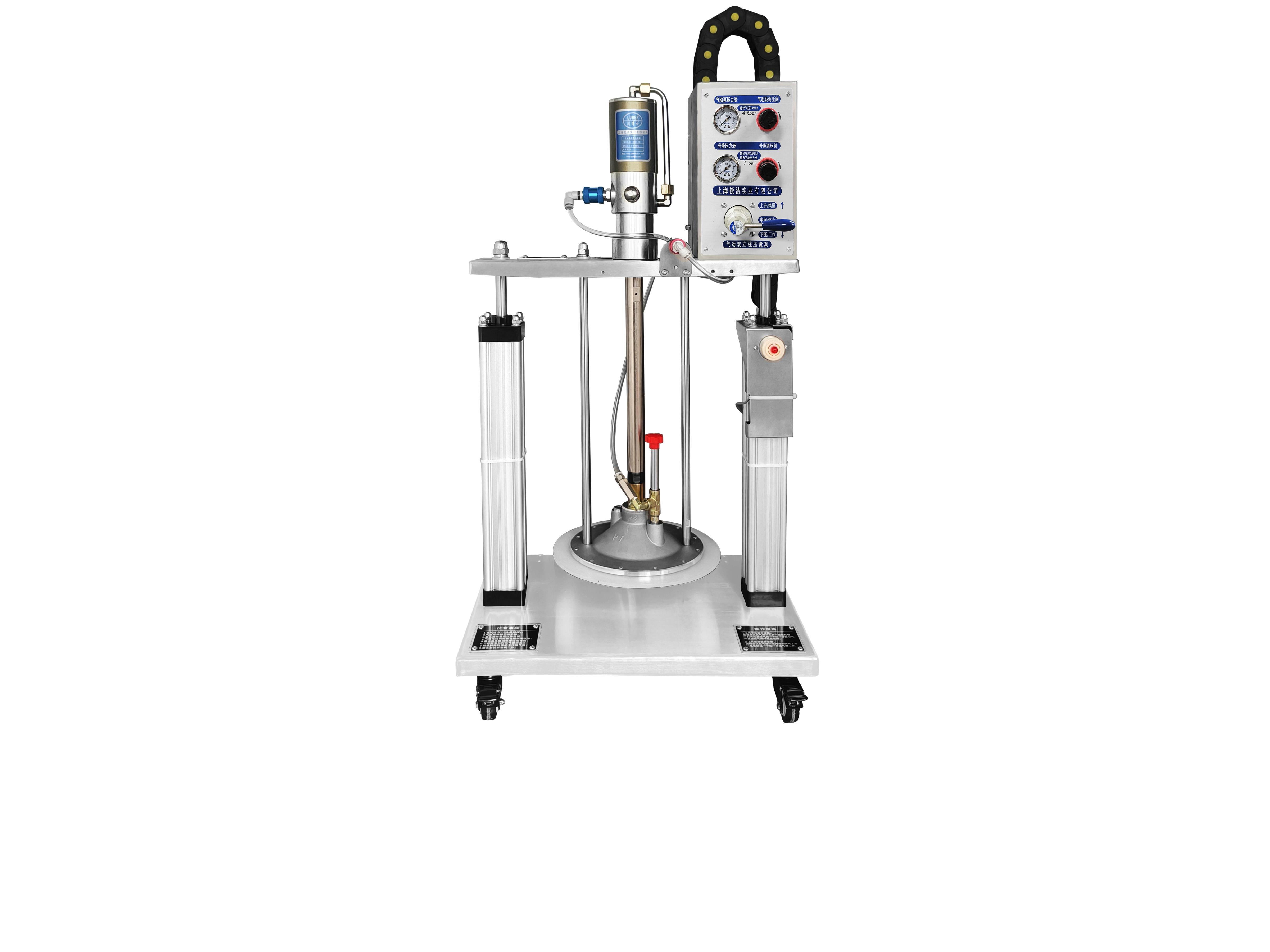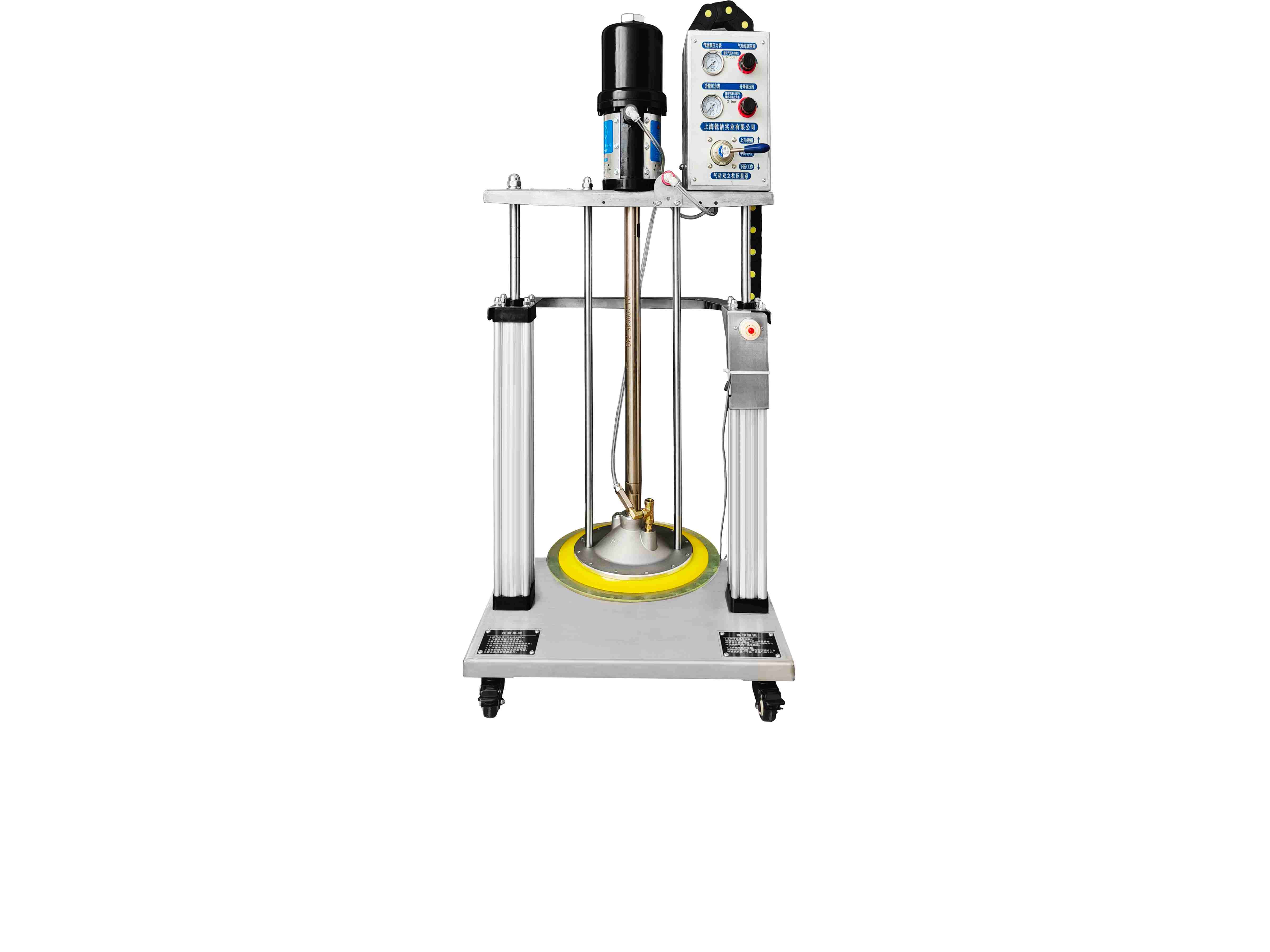 圖示為標準55加侖 170-220kg油脂桶用氣動雙立柱工業注脂機,配氣動工業油脂泵,帶出油排氣閥,有重型雙...
