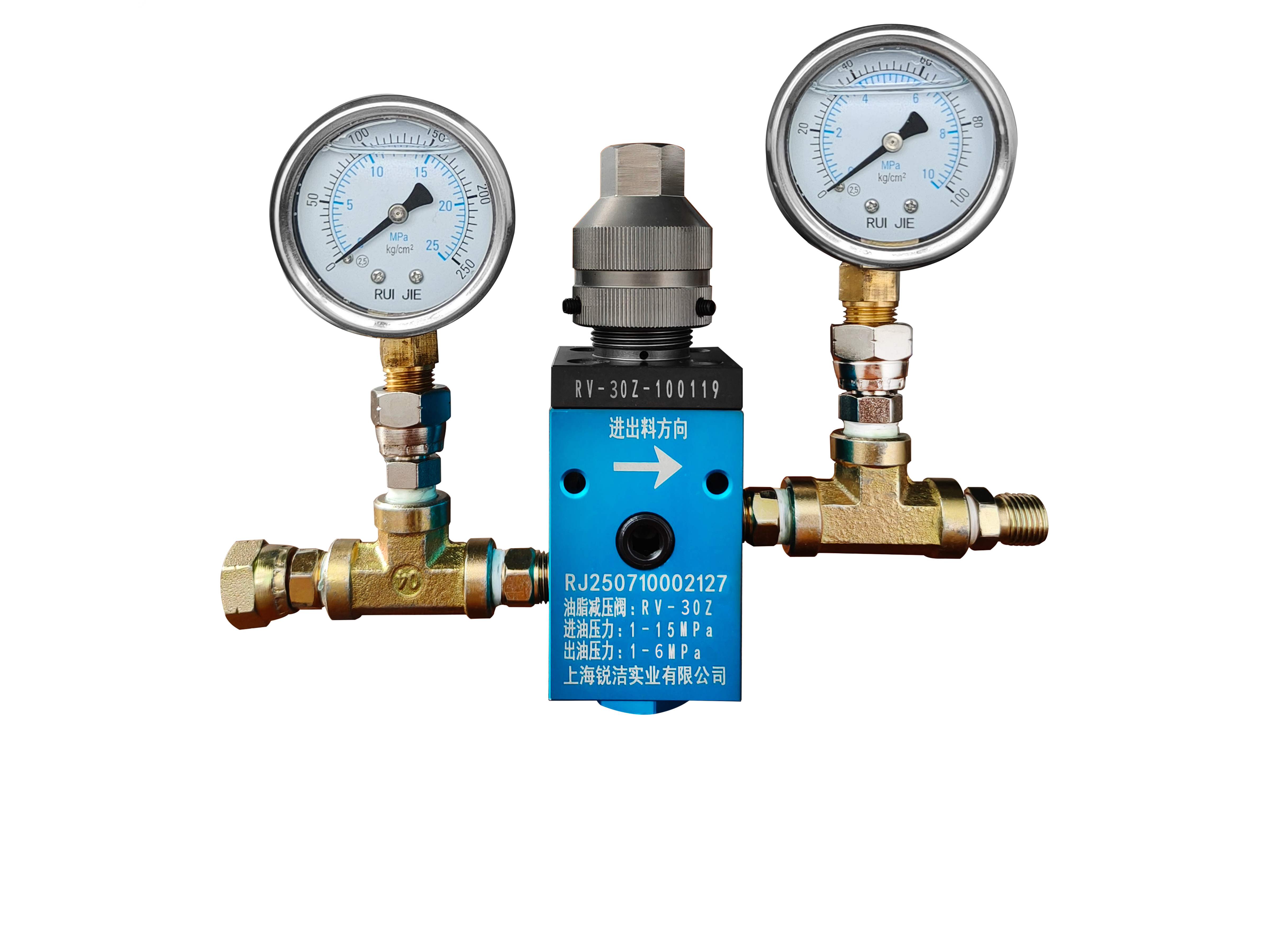 減壓閥可以將柱塞泵輸送的高壓油脂(10-40Mpa)減壓到定量閥點膠閥或者其它設備額定耐壓范圍內(8-150kg),并消除部分脈沖從而保護定量閥點膠閥或者其它設備,延長使用壽命。